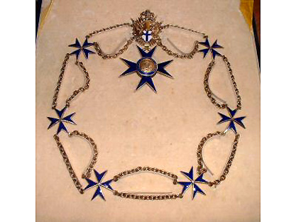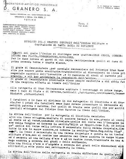 Artikel 26 - Der Grad des Commandeur kann nach spezieller Zustimmung des G.M. auch erblich sein, das heißt übertragbar in direkter männlicher Nachfolge und mangels Erben an den nächsten Verwandten; all das um den Fortbestand des Ordens zu sichern. Der Grad des Commandeur héréditaire wird im Allgemeinen jenem verliehen, der eine beträchtliche Spende an den Ordensschatz ergehen lässt; er kann gleichzeitig mit der Verleihung des Grand Croix verliehen werden.