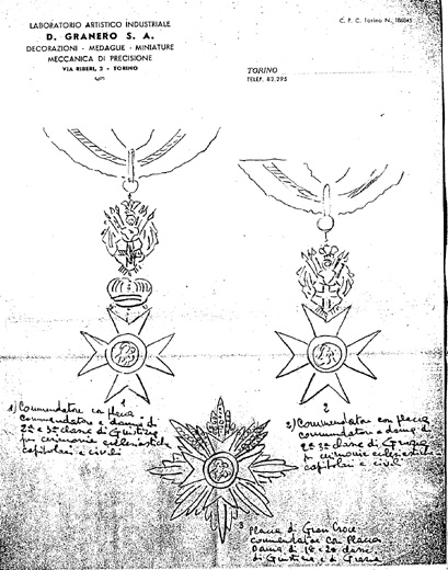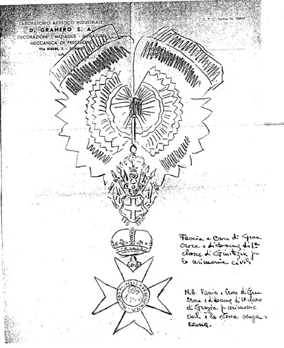 | Zweiseitiger maschingeschriebener Brief eines Turiner Herstellers mit | Beschreibung und (Entwurfs- ?) Zeichnungen der Insignien |