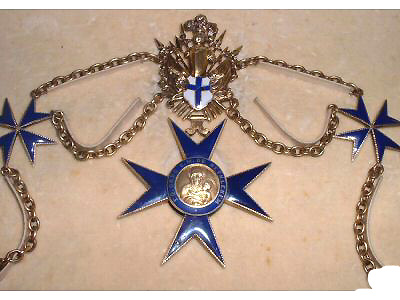 Artikel 34 - Die Ritter und die Damen tragen während der Zeremonien einen großen Mantel aus weißem Kastorin, gefüttert mit weißer Seide, und einem großen achteckigen Kreuz mit Goldborte, welches auf die linke Seite gestickt ist. Der Kragen des Mantels wird mit einem blaugoldenen Seidenband geschlossen. Im Gegensatz dazu ist der Mantel der Senatoren des Ordens aus weißem Velour, gefüttert mit blauer Seide und Goldfäden; er wird am Kragen mit einem Goldband geschlossen.