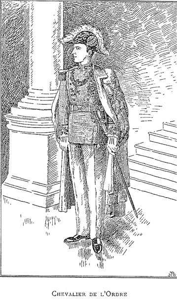 Artikel 35 - Die Zeremonienuniform der Ritter besteht aus: a) Ein Oberteil aus blauem Tuch, mit Kragen und Ärmelaufschlägen in weißem Kastorin, bestickt mit Gold, mit Knöpfen und Epauletten in Gold; b) Eine Hose aus weißem Kastorin, welche auf den Seiten ein doppeltes Goldband hat, mit blauem Gewinde. c) Ein Gürtel, auf dem das Schwert aufgehängt wird. d) Ein Paar goldene Sporen. e) Ein Zweispitz in Schwarz, verziert mit Goldlitze und weißen Straußenfedern. f) Ein Mantel aus weißem Kastorin, entsprechend den Anweisungen des Artikels 34.