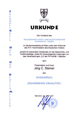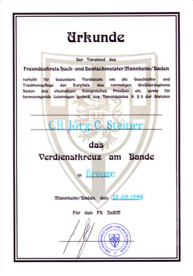 Klaus H. Feder; Der Freundeskreis Hoch- und Deutschmeister Mannheim/Baden und seine Auszeichnungen; in: Orden und Ehrenzeichen, 25-Jahre BDOS Jahrbuch 1999 |