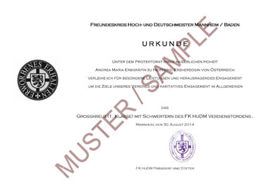 Anlässlich des 25jährigen Bestandsjubiläums stiftete FK HuDM Präsident Martin H. Wiegand einen Verdienstorden in 5 Klassen und 2 Varianten. Das Protektorat übernahm I.K.u.k.H. Andrea Erbgräfin zu Neipperg, Erzherzogin von Österreich, die älteste Tochter S.K.u.k.H. Erzherzog Dr. Otto von Habsburg-Lothringen, mit dem der Verein seit Gründung eng verbunden war.