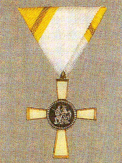 b.) Das Verdienstkreuz wird in 3 Stufen verliehen: Gold, Silber und Bronze. Das Verdienstkreuz ist ein vierschenkeliges Kreuz, Diagonaldurchmesser: 45 mm, weiß eingelegt, mit aufgesetzten Hl. Georg von 18 mm Durchmesser. Das Metall des Verdienstkreuzes ist in der 1.Stufe vergoldet, in der 2.Stufe versilbert und in der 3.Stufe bronziert. Das Verdienstkreuz wird an einem 40 mm breiten dreieckig gefalteten Bande montiert. Alle Stufen des Ordens werden am gelb-weißen Bande getragen, welches im gelben Teil einen 3 mm breiten Metallstreifen, je nach Ordensstufe (in Gold, Silber und Bronze) besitzt.