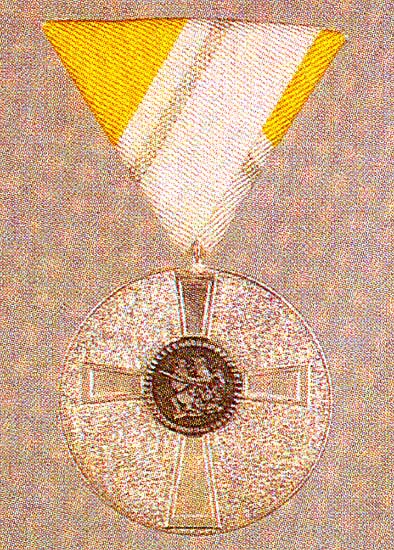 c.) Die Verdienstmedaille wird in 3 Stufen verliehen: Gold, Silber und Bronze. Die Verdienstmedaille ist einseitig geprägt und hat einen Durchmesser von 45 mm. Sie zeigt auf der Vorderseite das vierschenkelige Kreuz und den Hl. Georg in Reliefausführung. Das Metall der Verdienstmedaille ist in der 1. Stufe vergoldet, in der 2.Stufe versilbert und in der 3.Stufe bronziert. Die Verdienstmedaille wird an einem 40 mm breiten, dreieckig gefalteten Band, in den Farben gelb-weiß montiert. Das Band hat im weißen Teil einen eingewebten Metallstreifen von 3 mm Breite, je nach Ordenstufe in Gold, Silber und Bronze.