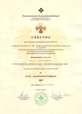 Das Dank- und Erinnerungskreuz 2007 des ÖKB Stadtverbandes Hollabrunn