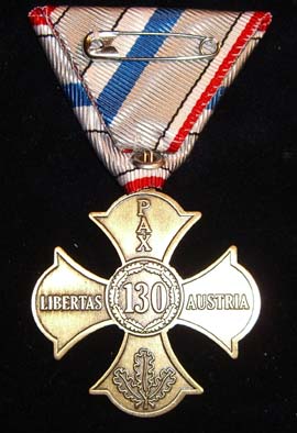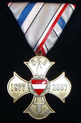 Anlässlich des 130jährigen Bestehens des ehemaligen Militär Veteranen Vereins Ober-Hollabrunn bzw. des 20jährigen Jubiläums reaktivierter ÖKB Stadtverband Hollabrunn vergibt dieser an alle Mitglieder, Freunde und Förderer zur Erinnerung ein sichtbares Zeichen der Dankbarkeit. Dieses Erinnerungskreuz ist mit einer Stückzahl von 400 begrenzt und wurde von der Firma Schwertner in Graz hergestellt. Trotz erstklassigen Entwurf und branchenüblicher Fertigungsqualität wurde das Zwischenringerl bei der Aufhängung gespart, sodass das Dreiecksband direkt durch die zu kleine, mitgeprägte Öse eingehängt werden muss. Nicht nur das das sehr unschön aussieht, es zeigt, das der Hersteller offenbar seinen Kunden nicht gut beraten hat.