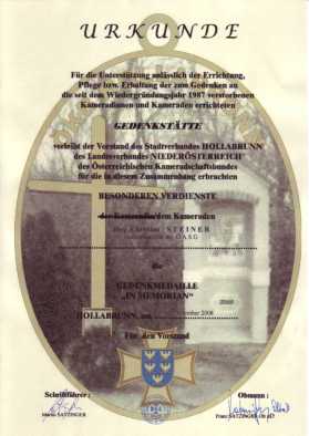 Der ÖKB Stadtverbandes Hollabrunn errichtet ein Marterl als Gedenkstätte und verleiht gegen entsprechende Spende eine Gedenkmedaille um dieses zu finanzieren.