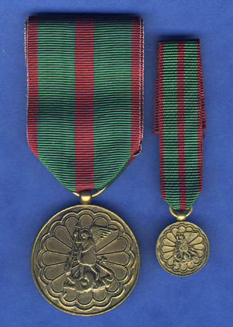 Die bronzefarbene Medaille hat einen Durchmesser von 35 mm und wird an einem 37 mm breiten Band an der linken Brustseite getragen. Das dunkelgrüne Band hat neben den dünnen Randstreifen einen etwas breiteren Mittelstreifen in Bordeaux. Die Medaille zeigt auf der Vorderseite inen aufgespannten Rundschirm imk Hintergrund, daru in der Mitte der Erzengel Michael mit dem Drachen. Auf der Rückseite befindet sich die lateinische Inschrift "QUIS UT DEUS" (Wer ist Gott?)