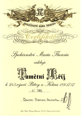 Im Jahre 2002 jährte sich die Schlacht von Kolin und die darauf folgende Stiftung des Militär-Maria Theresien-Ordens zum 245sten Male. Aus diesem Anlass verlieh das tschechische Komitee zur Erhaltung und Pflege der böhmischen Schlachtfelder rund um Kolin ein einstuftiges Erinnerungskreuz.