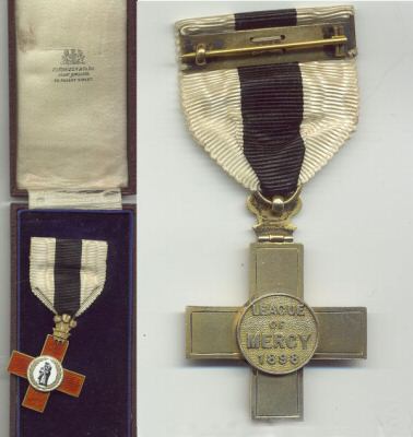 Die Dekorationen der ersten Verleihungsperiode (1899-1948) bestehen aus einem gleichschenkeligen silber-vergoldetes Kreuz, das von einer Krone mit drei Straußenfedern (Prince of Wales) überhöht ist. Die Überhöhung ist durch ein Schanier beweglich und hat auf der Rückseite die Öse, durch die der Bandring gezogen wird montiert. Auf der Vorderseite ist das Kreuz rot emailliert; das runde Mittelmedaillon, welches eine erwachsene Person mit drei Kindern umrahmt von zwei unten gebundenen Lorbeerzweigen zeigt, ist weiß und schwarz emailliert. Die Rückseite ist glatt und das Mittelmedaillon zeigt die vierzeilige Inschrift "LEAGUE OF MERCY 1899". Im Februar 2005 wurde in eBay ein entsprechendes Stück angeboten, welches aufgrund begleitender Dokumente und Briefe auf einen 1924 verstorbenen Beliehenen hinwies, das auf der Rückseite ganz deutlich die Jahreszahl 1898 statt 1899 zeigt - eine Erklärung dafür konnte bis dato nicht gefunden werden.