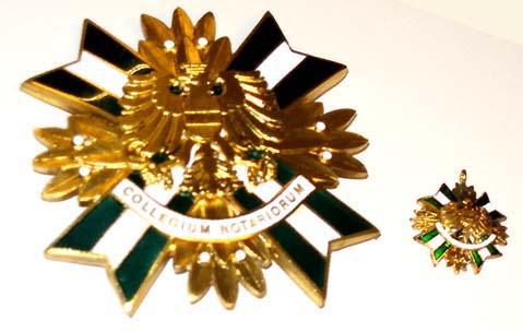§ 4 | (1) Das Ehrenzeichen ist eine Brustdekoration (Kleinod). Es besteht aus einem achtspitzigen Andreaskreuz im Ausmaß von 65 mm von Spitze zu Spitze, mit Broschierung, die Felder grün-weiß-grün emailliert, golden bordiert, mit goldenen Lorbeerblättern zwischen den Kreuzschenkeln, überhöht von dem goldenen Adler des österreichischen Bundeswappens. Die Farben des Wappenschildes sind heraldisch-graphisch gekennzeichnet. Unter dem Adler ist ein weiß emailliertes Schriftband mit der Aufschrift: "COLLEGIUM NOTARIORUM" angebracht. |