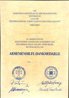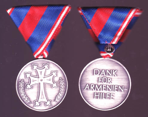 Anläßlich der Hilfsaktion nach dem Erdbeben 1989 in Armenien wurde eine Dankmedaille von der Armenischen Kirche zusammen mit der ÖASG gestiftet. Die Urkunden wurden vom Patriarchen und von Generalsekretär der ÖASG unterschrieben (und von deren Stellvertretern). Die 38mm große silber-patinierte Medaille zeigt auf der Vorderseite das armenische Patriarchenkreuz und auf der Rückseite die vierzeilige Inschrift "Dank für Armenien Hilfe". Zusätzlich wurden 6 Medaillen vergoldet produziert um sie den jeweils höchsten Vertreter beider Organisationen zu verleihen. Aufgrund fehlender Unterlagen kann eine Gesamtzahl der verliehenen silbernen Medaillen nicht exakt ermittelt werden, es waren jedoch mit Sicherheit weniger als 250 Stück. Das 40mm breite Band ist gleichmäßig blau-rot-blau gestreift und hat rot-weiß-rote Randstreifen.