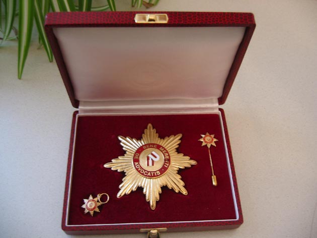 § 4 | (1) Das Ehrenzeichen ist eine Brustdekoration. Es besteht aus einem achtstrahligen Goldstern, im Mittelfeld ein stilisiertes "R", rot-weiß auf Metallgrund, umgeben von rotem Schriftrand mit Metalltext: "BENE MERENTI DE ADVOCATIS". |