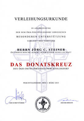 Um die dringend Notwendige Restaurierung der Vereinsfahne realisieren zu können, stiftet der Ortsverband Perchtoldsdorf des Österreichischen Kameradschaftsbundes (ÖKB), Landesverband Niederösterreich (LV-NÖ), in der Folge ÖKB-Perchtoldsdorf genannt das Donatskreuz. Um unterschiedlich hohen Spenden gerecht werden zu können, gliedert sich das Donatskreuz in drei Stufen. Es sind dies das G R O S S E D O N AT S K R E U Z das D O N AT S K R E U Z 1 . K L A S S E sowie das D O N AT S K R E U Z . |