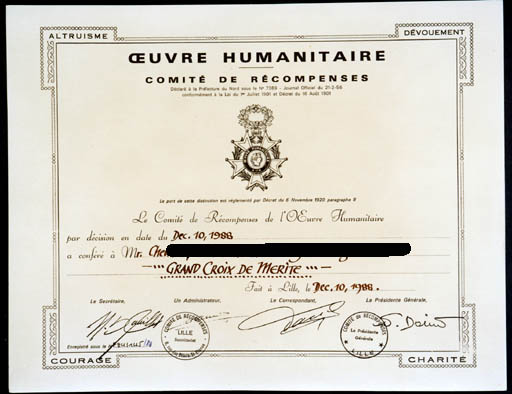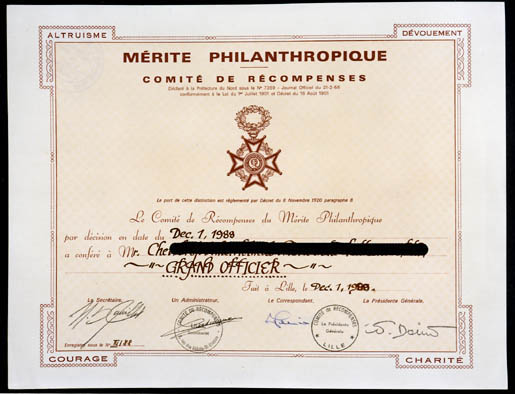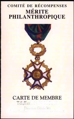 In Frankreich gab es nach dem Vereinsgesetz von 1900 die Möglichkeit wohltätige, vor allem nicht auf Gewinn orientierte, private Gesellschaften öffentlichen Rechts zu gründen, was nach dem 2. Weltkrieg nicht mehr in dieser Form möglich ist. Zwei von diesen Gesellschaften, die 1937 in Paris unter dem Namen „Union Philanthropique des Œuvres Françaises“ und die 1920 in Toulouse gegründete „Œuvre Humanitaire“ beschlossen im März 1954 in Lille ein Verleihungskomitee zu gründen um fortan gemeinsam zu wirken und besondere Personen für Ihre Werke auszuzeichnen. Im April 1955 wurde die Vereinigung beider Organisationen realisiert und die neue Vereinigung nannte sich nunmehr: „Comité de Récompenses Mérite Philanthropique et Œvre Humanitaire“. Seit dieser Zeit hat sich diese Gesellschaft unaufhörlich weiter entwickelt und auch internationale Dimensionen angenommen. Der Name des aktuellen Präsidenten lautet Maurice Turlotte. Für einen jährlichen Mitgliedsbeitrag von 20,- Euro können Privatpersonen Mitglieder werden um die wohltätigen Werke zu unterstützen. Mit den gesammelten Einnahmen werden soziale Einrichtungen wie zum Beispiel ein Krebsforschungsinstitut unterstützt.