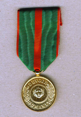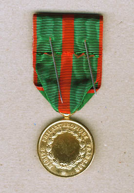 Die runden Medaillen in Bronze, Silber und Gold haben einen Durchmesser von ca. 31mm und zeigen auf der Vorderseite die Wörter: oben "DEVOIRE" (Pflicht) und unten "HUMANITE" (Menschlichkeit) im Sinne von "Pflicht zur Menschlichkeit" oder "Pflicht gegenüber der Menscheit". Auf der Rückseite umgibt ein Lorbeerkranz eine glatte Fläche - hier könnte man evtl. einen Namen eingravieren - und die Umschrift lautet: "MÉRITE PHILANTHROPIQUE FRANÇAIS". Die höheren Stufen "Grand Médaille" folgen den übliche Ordensstufen vom ca. 42 mm breiten Ritterkreuz, das an einem 37 mm breiten Band auf der Brust getragen wird, über das Offizierskreuz mit einer Rosette auf dem Band, zum Halskreuz, dem Halskreuz mit Bruststern und dem Großkreuz an der Schärpe mit Bruststern. Die Dekoration erinnert stark an die äußere Form des Monegassischen Hausordens vom Heilihen Karl, hat jedoch als Überhöhung einen (republikanischen) Lorbeerkranz anstatt einer Krone. Im Mittelmedaillon wieder der Frauenkopf als Symbol der Humanität und die Umschrift: "MÉRITE PHILANTHROPIQUE FRANÇAIS". Das hellgrüne Band zeit in der Mitte einen 6mm breiten hellroten Streifen und hat darüber hinaus noch schmale, ebenfalls hellrote Randstreifen.