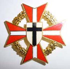 a) Brustdekoration (Kleinod): 55 x 55 Millimeter großes, rot emailliertes, golden bordiertes Malteserkreuz mit weiß emailliertem Mittelkreuz, golden konturiert. In der Mitte ein erhaben aufgelegtes Schild, weiß emailliert, mit eingelegtem lateinischen Kreuz, schwarz, golden konturiert. Die Verbindung des Kreuzes mit dem dreieckig gefalteten Bande wird durch eine vergoldete, geprägte, viereckige Öse mit einem vergoldeten, schmalen, ovalen Ring hergestellt.