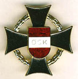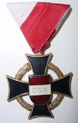 Steckdekoration (Kleinod): 48 x 48 Millimeter großes, schwarz lackiertes, golden bordiertes Leopoldkreuz. In der Mitte ein erhaben aufgelegter Bindenschild, rot-weiß-rot emailliert. Im weißen Feld aufgelegt die Inschrift "ÖSK", gold. Das Kleinod ist auf einem goldenen Lorbeerkranz aufgelegt.