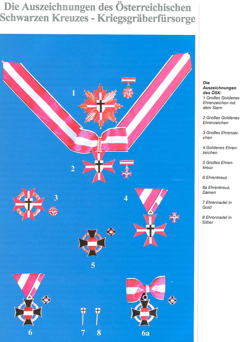 Seit Ende der 1960er Jahre verleiht das Österreichische Schwarze Kreuz - Kriegsgräberfürsorge ein mehrstufiges Ehrenzeichen um verdiente Mitglieder, Mitarbeiter und hervorragenden ehrenamtlichen Einsatz bei der Spendensammlung entsprechende würdigen zu können. Für die Dekorationen des ÖSK liegt eine allgemeine Tragegenehmigung zur österreichischen Bundesheer-Uniform vor. Zwischen der Verleihung der unterschiedlichen Dekorationen ist eine Frist, je nach Grad der Auszeichnung, von 2 bis 4 Jahren vorgeschrieben.