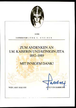 Die letzte Kaiserin von Österreich und Königin von Ungarn Zita wurde am 1. April 1989 in Wien beigesetzt. Selbstverständlich war dies ein entsprechend prunkvoller Anlass für alle möglichen uniformierten und sonstigen vaterländischer und monarchistischer Organisationen daran teilzunehmen und natürlich ein entsprechend großer logistischer Aufwand für das Organisationskomitee. Um sich bei allen Organisatoren zu bedanken ließ Kronprinz Erzherzog Dr. Otto von Habsburg-Lothringen eine von ihm original unterschriebene Urkunde verteilen, wobei offenbar an das Vorbereitungskomitee unter der Leitung von Alexander Sixtus Freiherr von Reden 1.600 Stück übergeben wurden während rund 400 weitere meist an verschiedene landsmannschaftlich organisierte Burschenschaften, sowie andere kleinere Organisationen, die sich selbst organisiert hatten ausgegeben worden waren.